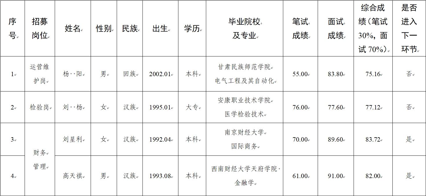 2025-04-20根据《甘肃水建工程开发有限公司2025年公开招聘特殊岗位工作人员公告》有关规定,公司对拟录用的3名人员已完成了资格审查、笔试、面试、考察、体检等工作程序,现予以公示,接受社会各界监督。如发现在德、能、勤、绩、廉等方面有影响录用的问题,可通过电话、手机